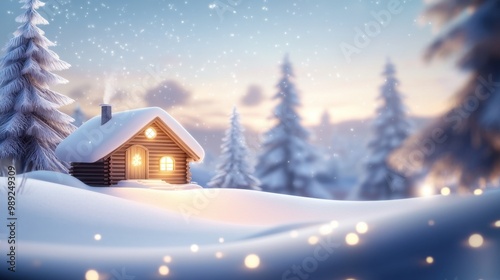 Fototapeta premium Rustic winter background with a cozy wooden cabin, snow-covered trees, and a soft winter glow reflecting off the snow-covered ground.