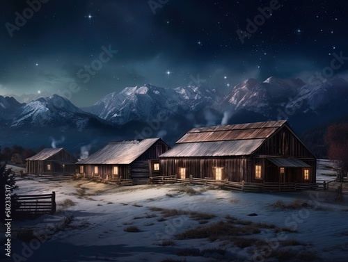© FarmBoy, Fototapeta premium Rustic Winter Cabin with Snowy Mountains and Beautiful Night Sky, Milk Way