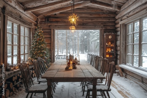 © ChaoticMind, Obraz premium Rustic winter dining area with wooden table and Christmas decorations in a snowy forest setting