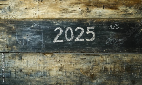 Fototapeta premium Rustic wood background, 2025 chalk inscription.