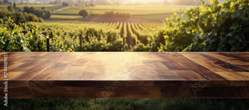 © BISMILAH, Obraz premium Rustic Wood Table with Vineyard Backdrop, A Taste of Country Charm