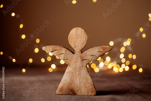 Fototapeta premium Rustic wooden angel figurine on holiday lights