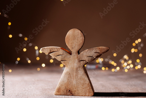 Obraz premium Rustic wooden angel figurine on holiday lights