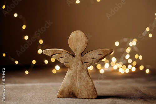 Fototapeta premium Rustic wooden angel figurine on holiday lights