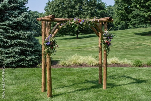 © upnowgraphics, Fototapeta premium Rustic Wooden Archway Decorated with Colorful Flowers in a Grassy Outdoor Setting