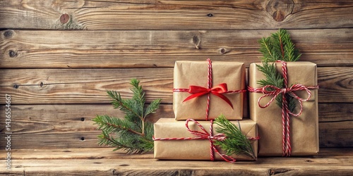 © parichart, Obraz premium Rustic Wooden Background Featuring Stacked Wrapped Gifts Adorned with Evergreen Sprigs and Festive Ribbon
