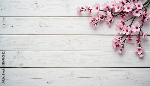 Fototapeta premium Rustic Wooden Background with Whitewashed Planks and Cherry Blossoms