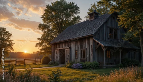 © Kitta Studio, Obraz premium Rustic wooden barn at sunset with vibrant golden sky and trees