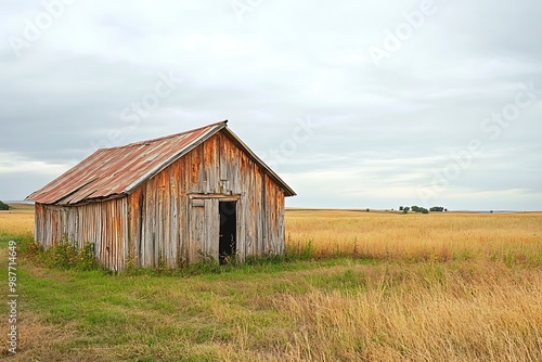 © atar, Obraz premium Rustic Wooden Barn in a Field of Wheat Under a Cloudy Sky
