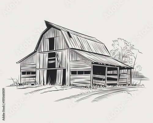 Obraz premium Rustic Wooden Barn Sketch in Rural Setting