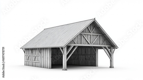 © Stanislau, Obraz premium Rustic wooden barn with exposed timber frame located in a countryside setting under bright sunlight