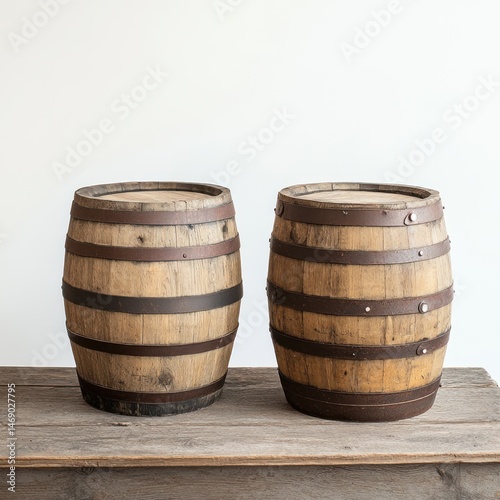 Obraz premium Rustic wooden barrels on table, studio backdrop
