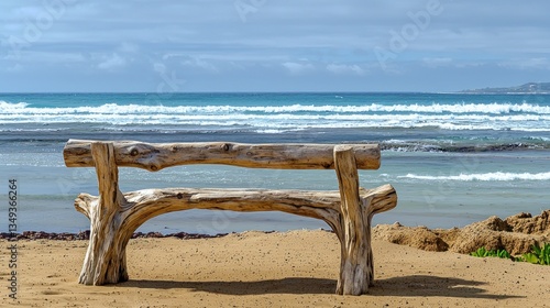 Fototapeta premium Rustic wooden bench on sandy beach overlooking ocean waves