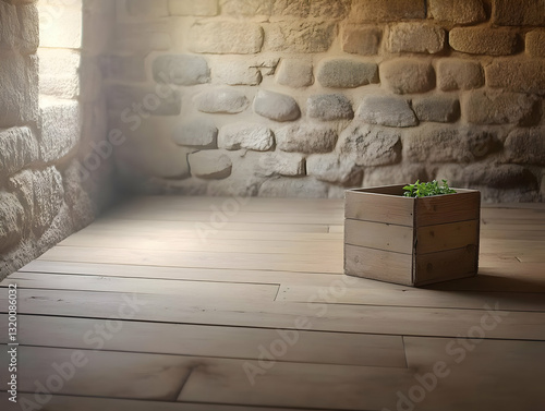 © Siasart Studio, Obraz premium Rustic Wooden Box with Greenery sits on Light Wooden Floor against a Stone Wall Background, Illuminated by Soft Sunlight.