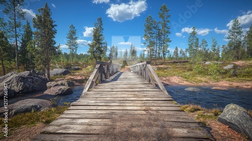© affan, Fototapeta premium Rustic wooden bridge crossing stream, forest background, sunny day, nature scene