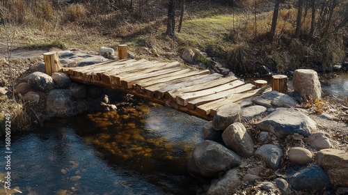 © deni, Obraz premium Rustic wooden bridge over a stream