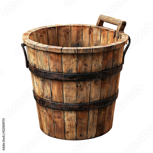 © sri, Obraz premium Rustic Wooden Bucket with Metal Bands for Farm Use