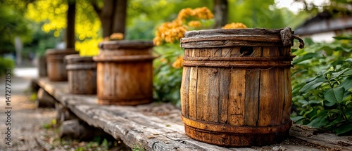 © Humairaa_Std, Fototapeta premium Rustic wooden buckets line weathered bench