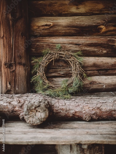 © Anat art, Obraz premium Rustic Wooden Cabin Decor Featuring a Pine Wreath Against a Log Wall in a Natural Setting