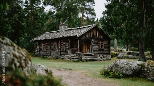 © Ezio, Fototapeta premium Rustic Wooden Cabin Surrounded by Green Trees in Natural Forest Setting