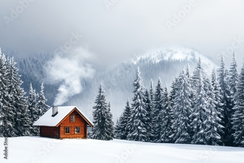 © Dina, Fototapeta premium rustic wooden cabin surrounded by snow covered pine trees, smoke gently rising from the chimney, minimal background with copy space at daytime in the forest