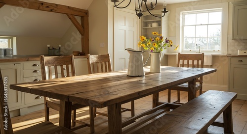 © Intan, Fototapeta premium Rustic Wooden Dining Table with Benches and Flowers