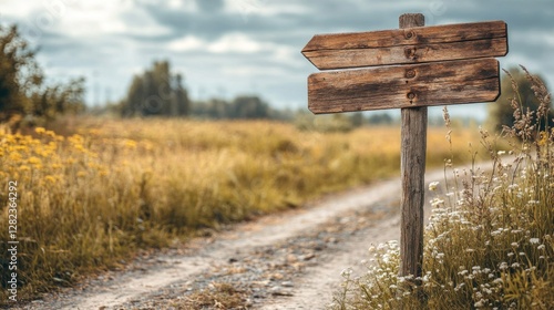 Naklejka premium Rustic Wooden Directional Signpost along Rural Road with Cloudy Sky in Summer