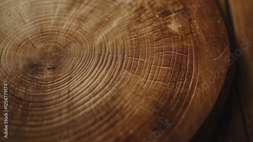 Naklejka premium Rustic wooden disc close-up, grain detail, blurred background, craft texture