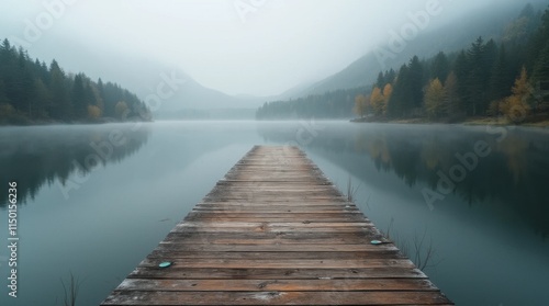 © Burak, Fototapeta premium Rustic Wooden Dock Extending into Calm Lake
