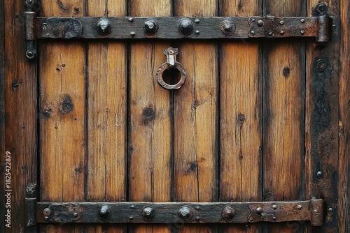 Fototapeta premium rustic wooden door with metal straps, rivets and circular iron knocker on weathered vertical planks evoking history, sturdy construction and timeless charm