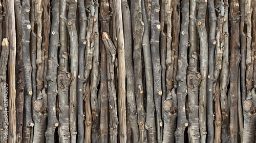 Obraz premium Rustic Wooden Fence Background, Texture Of Natural Unpainted Branches, Vertically Arranged
