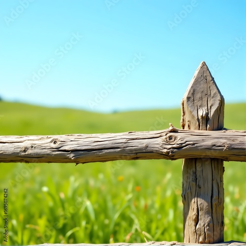Fototapeta premium Rustic Wooden Fence Boundary in Lush Green Meadow Field