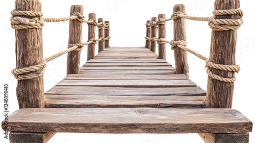 Obraz premium Rustic wooden footbridge with rope railings, isolated on a white background. Perfect for conveying concepts of transition, connection, or outdoor adventure.