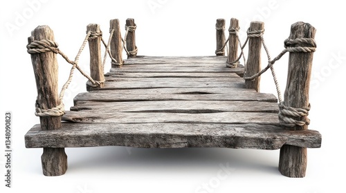 Fototapeta premium Rustic wooden footbridge with rope railings, isolated on a white background. Perfect for conveying concepts of transition, connection, or outdoor adventure.
