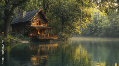 © THUA, Obraz premium rustic wooden house by serene riverbank surrounded by lush trees