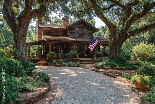 © Ali, Fototapeta premium Rustic wooden house, lush garden, American flag.