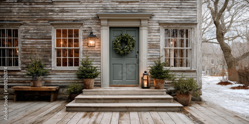 © Jane_S, Obraz premium Rustic wooden house with wreath and lanterns in winter rural setting