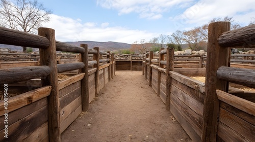 © Bussakon, Naklejka premium Rustic wooden live pen and outdoor corral with dirt floor and surrounding hills under a cloudy sky