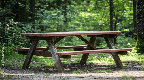© Nipa, Fototapeta premium Rustic Wooden Picnic Table in Forest Setting