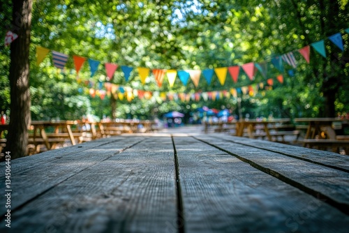 © Selsi, Obraz premium Rustic wooden picnic table in park