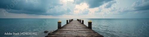 Obraz premium Rustic wooden pier stretches towards a dramatic, overcast sky above the grey...