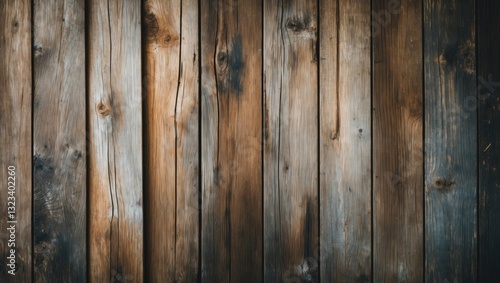 © Levan, Naklejka premium Rustic wooden plank background with rich brown and gray tones, featuring vertical alignment and varied textures for a vintage aesthetic.