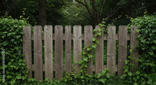 Fototapeta premium Rustic wooden planks forming a boundary fence, partially covered by lush, green foliage and winding vines in a peaceful garden setting ,home., wooden, growth