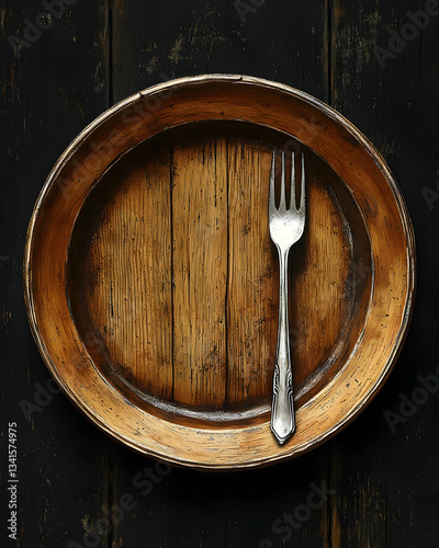 © Get it, Fototapeta premium Rustic wooden plate with a single fork, set against a dark wooden background. Overhead view. Simple, minimalist composition
