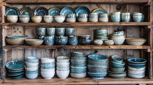 © Fana Art, Fototapeta premium Rustic wooden shelves display various sizes and shades of ceramic bowls and cups.