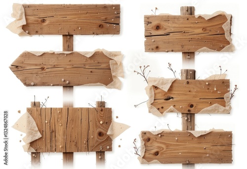 © GL, Naklejka premium Rustic Wooden Sign Collection with Natural Paper Accent on White Background