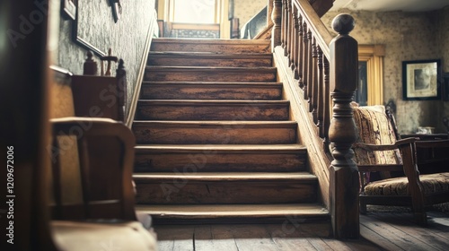 © Mega, Obraz premium Rustic wooden staircase in vintage home interior.