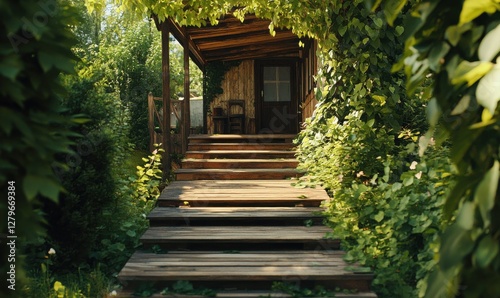 Fototapeta premium Rustic wooden staircase leading to a warm and inviting cottage, framed by lush greenery, evoking charm and simplicity.