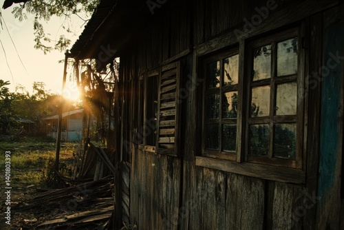 © Fire Light, Obraz premium Rustic Wooden Structure at Sunset