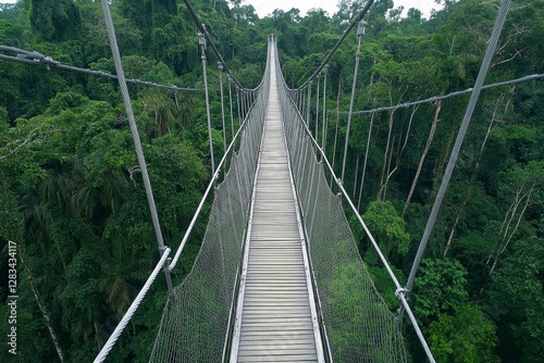© Mind, Obraz premium Rustic Wooden Suspension Bridge Across Lush Rainforest Canopy